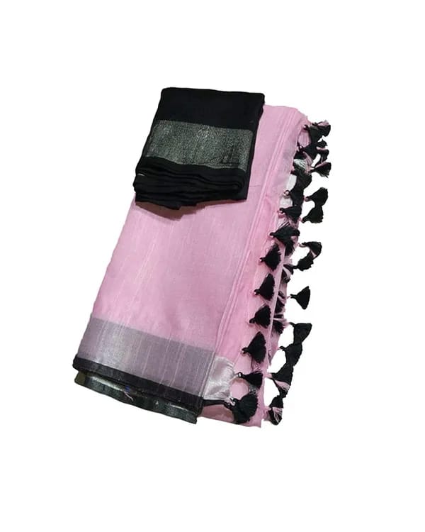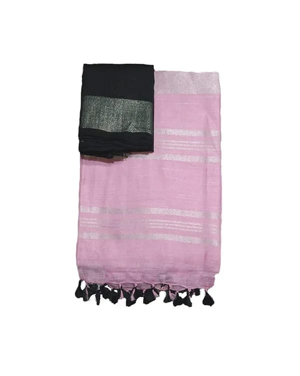 Baby Pink-Black Women’s Handloom Bhagalpuri Cotton Linen Blend Saree Ethnic Wear With Contrast Unstitched Blouse Piece